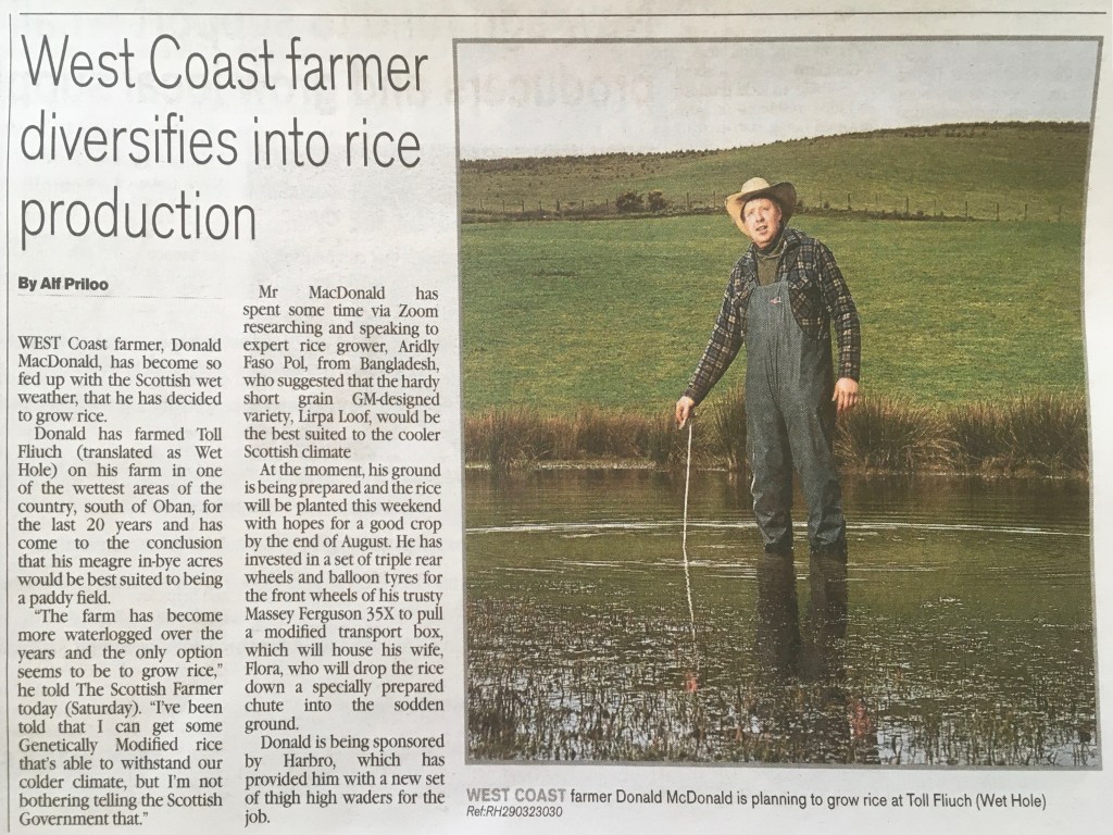 WEST Coast farmer, Donald MacDonald, has become so fed up with the Scottish wet weather, that he has decided to grow rice. Donald has farmed Toll Fliuch (translated as Wet Hole) on his farm in one of the wettest areas of the country, south of Oban, for the last 20 years and has come to the conclusion that his meagre in-bye acres would be best suited to being a paddy field. "The farm has become more waterlogged over the years and the only option seems to be to grow rice," he told The Scottish Farmer today (Saturday). "Ive been told that I can get some Genetically Modified rice that's able to withstand our colder climate, but I'm not bothering telling the Scottish Government that." Mr MacDonald has spent some time via Zoom researching and speaking to expert rice grower, Aridly Faso Pol, from Bangladesh, who suggested that the hardy short grain GM-designed variety, Lirpa Loof, would be the best suited to the cooler Scottish climate. At the moment, his ground is being prepared and the rice will be planted this weekend with hopes for a good crop by the end of August. He has invested in a set of triple rear wheels and balloon tyres for the front wheels of his trusty Massey Ferguson 35X to pull a modified transport box, which will house his wife, Flora, who will drop the rice down a specially prepared chute into the sodden ground. Donald is being sponsored by Harbro, which has provided him with a new set of thigh high waders for the job.